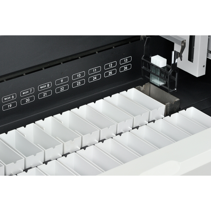 染色站點數(shù)量 總站點數(shù)26個,(含試劑站點17個,水洗站點4個,烤缸1個,加載/卸載站點≥4個(智能配置,其中2個缸可設(shè)置為試劑缸) |